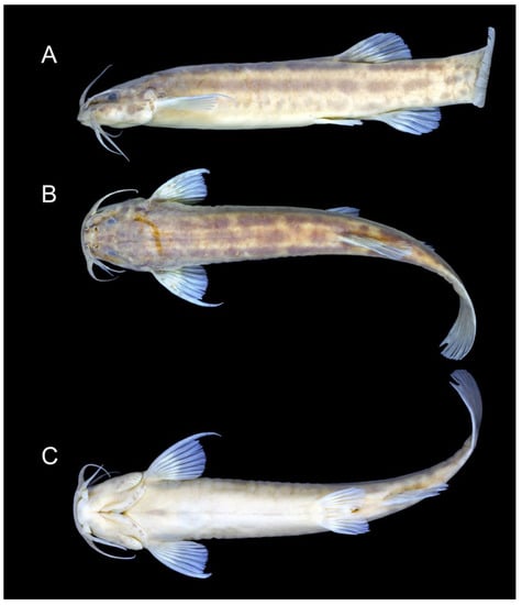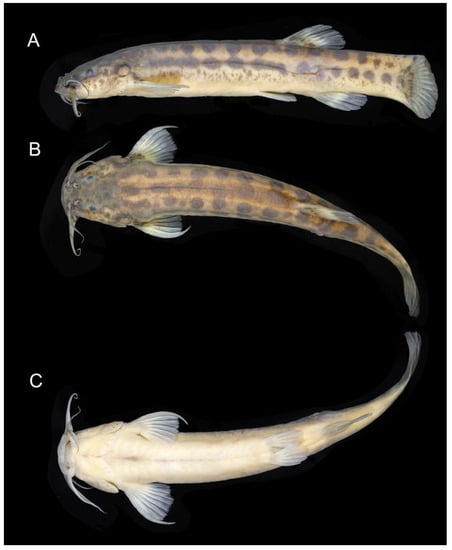 Colouration in alcohol (Figure 9): The ground colour of the flank and head is light yellowish grey. LDPZ 1–3 represented by dark brown parallel stripes. LDPZ-4 is represented by dispersed dark brown chromatophores. LDPZ 2, 3 and 4 slightly converge on the caudal peduncle end. Venter white. The dorsal surface of the head is dark brown, and the lateral surface is pale grey with a great concentration of dark brown spots. Nasal and maxillary barbels light brown, rictal barbel light grey. Fins hyaline, with small black spots on the basal portion of pectoral, dorsal and caudal fins. Specimens below 40 mm SL LDPZ 1–3 are represented by a longitudinal row of horizontally elongated black spots.