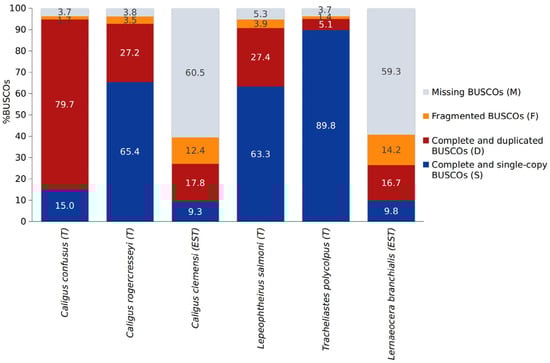 - Mathieu-Bégné, E.; Loot, G.; Blanchet, S.; Toulza, E.; Genthon, C.; Rey, O. De Novo Transcriptome Assembly for Tracheliastes polycolpus, an Invasive Ectoparasite of Freshwater Fish in Western Europe. Mar. Genomics 2019, 46, 58–61. [Google Scholar] [CrossRef]
