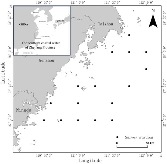 The quality and nutritional composition of marine organisms, such as DHA and EPA, are not only related to the species but also depend on the nutritional composition of the food, habitat, temperature, seasonality, environmental conditions, age, and sex; among which, the season can be especially important because it affects the composition of the food [,]. Differences in the chemical composition of fish are closely related to feed intake, and the presence of cues typically associated with the winter season suggests a scarcity of food supplies [,], making it important to assess the nutritional status of fish in the spring. It is important to note that April marks the beginning of stock enhancement for marine organisms in China. Therefore, a study was conducted in the southern coastal water of Zhejiang Province to investigate the capture of marine species in April 2019.