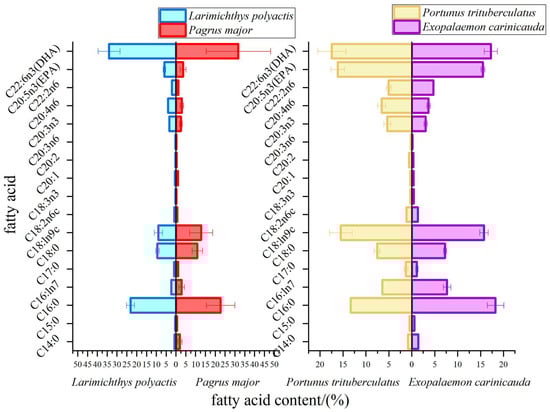 Figure 2 displays the primary fatty acid compositions of little yellow croaker, red sea bream, swimming crab, and ridgetail white prawn in the coastal waters of southern Zhejiang Province. The saturated fatty acids (SFA) of the four marine organisms ranged from 23.61% to 37.65% of the total fatty acids, with higher concentrations observed in the little yellow croaker and red sea bream. Monounsaturated fatty acids (MUFA) accounted for 12.97% to 24.36% of the total fatty acids, with swimming crab and ridgetail white prawn exhibiting higher levels. Polyunsaturated fatty acids (PUFA) constituted 12.97% to 24.36% of the total fatty acids in the little yellow croaker and red sea bream, with swimming crab and ridgetail white prawn having higher proportions. PUFA was found to be the predominant fatty acid in all four species, with percentages ranging from 43.99% to 53.47%. The proportion of C22:6n3 (DHA) was consistently higher than that of C20:5n3 (EPA) in all species. Marine organisms acquire long-chain n-3 fatty acids, specifically EPA and DHA, predominantly through their feeding behavior []. This reliance on external sources of these fatty acids can be attributed to evolutionary adaptations that have developed in response to the naturally abundant presence of PUFA in marine habitats []. Organisms that exhibit a significant prevalence of dinoflagellates in their dietary intake are commonly associated with a notable proportion of DHA in their fatty acid composition, whereas diatom-derived diets are characterized by a substantial proportion of EPA []. This study revealed that the little yellow croaker exhibited approximately 34% DHA and 6% EPA. The red sea bream had a somewhat lower content of the two crucial fatty acids compared to the little yellow croaker, with DHA and EPA levels measuring around 32% and 4%, respectively. This observation implies that the inclusion of dinoflagellate food has a greater impact on the dietary composition of both fish species. The percentage of DHA content in swimming crab and ridgetail white prawn showed a similarity, ca. 17%. Additionally, the percentage of EPA content in the swimming crab was approximately 16%, while in ridgetail white prawn, it was approximately 15%. No statistical variations were found in the levels of DHA and EPA between the two crustaceans, indicating that both crustaceans absorbed similar quantities of food derived from diatom and dinoflagellate sources. The DHA content percentage of the two marine fish species was found to be greater in comparison to that of the two crustaceans. This disparity can be attributed to the variance in the trophic levels between the two groups [,,].
