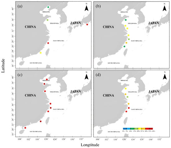 The levels of DHA and EPA present in four distinct marine species originating from various coastal waters are shown in Table 2. The little yellow croaker and red seabream species exhibited the highest levels of DHA content, measuring 22.75% and 31.72%, respectively, in the southern coastal water of Zhejiang Province. Conversely, the lowest DHA content was observed in the southern coastal water of the Shandong Peninsula (6.84%) and the northern coastal water of the Bohai Sea (9.14%). The EPA content had minimal variations across different areas. The coastal waters of Yancheng City in Jiangsu Province and southern Fujian Province displayed the highest EPA content for little yellow croaker and red seabream, respectively, while the southern coastal water of the Shandong Peninsula had the lowest EPA content. Both the little yellow croaker and red seabream exhibited significant variations in DHA levels while displaying minor oscillations in EPA levels across different sea areas. The observed phenomenon may be attributed to variations in food availability across different regions. In instances of limited food supply, both the small yellow croaker and red seabream exhibit a preference for consuming EPA in order to meet their energy demands, implying that DHA holds greater importance in the physiological processes of marine fish [].