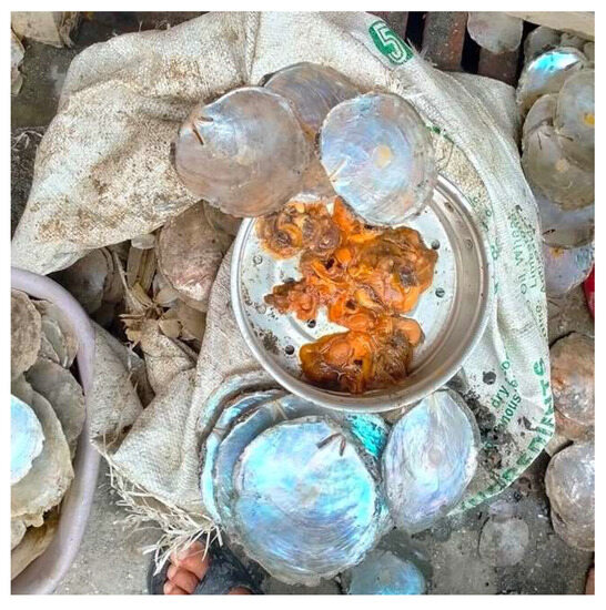 Fish and other aquatic organisms are processed into various food and non-food products. During the processing of P. placenta, large amounts of by-products are under-utilized, if not wasted. The harvesting of P. placenta provides local fishermen not only income from selling translucent and durable shells for the shell craft industry, but also cheap and nutritious protein sources for their families [3] (Figure 3), though as noted above, over-reliance on this food source may cause issues. A more efficient utilization of the by-products of P. placenta processing would reduce the problem of disposal and subsequent environmental pollution. Furthermore, the shellfish will be valorised, which would elevate the nutritional and economic status of the fishing community, wherein P. placenta processing is one of the primary industries.
