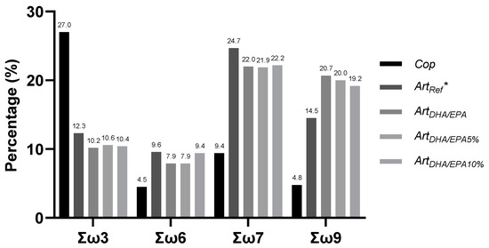 Characterization of the fatty acid families ω3, ω6, ω7, and ω9 in each of the four tested dietary treatments. Cop—Natural copepods; ArtRef—Unenriched Artemia nauplii; ArtDHA/EPA5%—95% 2:1 DHA/EPA ratio enriched Artemia metanauplii and 5% natural copepods; and ArtDHA/EPA10%—90% 2:1 DHA/EPA ratio enriched Artemia metanauplii and 10% natural copepods. * Although ArtRef was not directly tested, it served as the basis for the enriched Artemia dietary treatments; therefore, it is presented for comparison purposes.