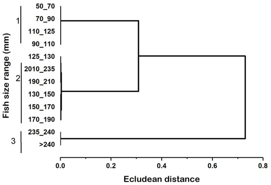 Cluster analysis of the fish size groups in terms of prey occurrence based on the Euclidean distance.