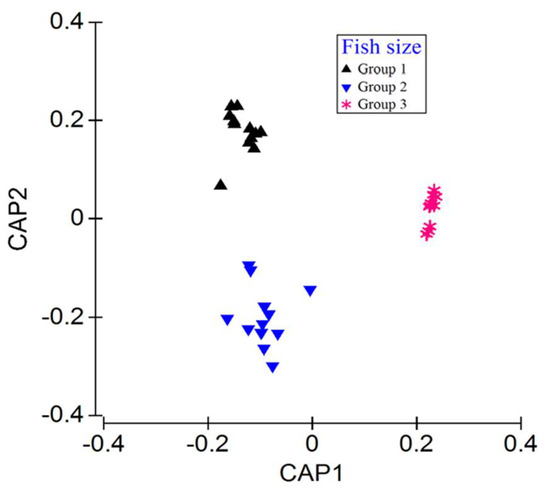 Canonical analysis of principal coordinates (CAP) ordination plots based on the proportion of the feed compositions of the three length classes of fish.