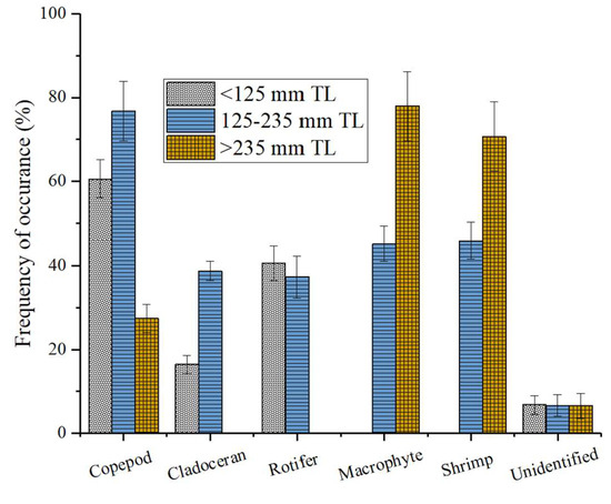 The findings from this study demonstrate that there are significant differences in the food composition between the three size groups (p < 0.05), as confirmed by the PERMANOVA analysis (Table 4). It was also affirmed by the CAP ordination plot that size differences existed among the sampled individuals (Figure 4). As shown in Figure 5, the proportion of food groups varied with the fish size. In the smaller fish class, copepods and rotifers were the predominant food groups. For the medium-sized fish class, copepods, rotifers, macrophytes, and shrimps were the top food groups. Finally, macrophytes and shrimp were the two most proportioned food groups for the large-sized fish classes.