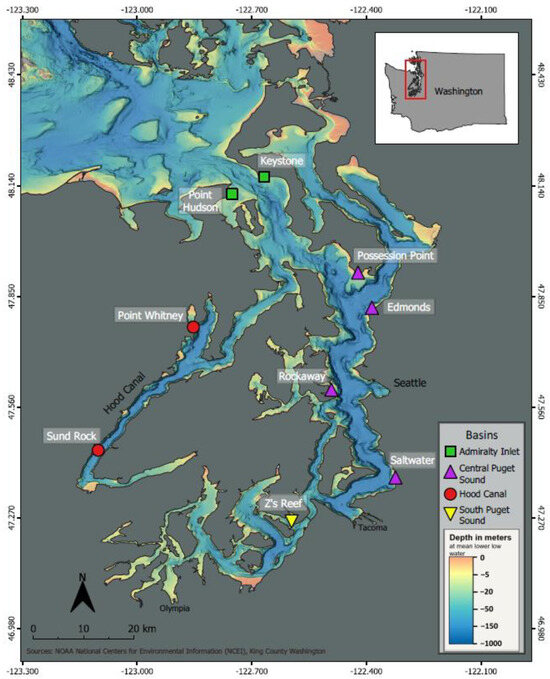 Our region of interest is the sheltered estuarine inlet of the Puget Sound. We surveyed 9 rocky or artificial reef sites (Figure 1, Table 1), starting with Rockaway in 2009 and gradually adding sites through the addition of Edmonds Dive Park in 2019; this paper focuses on surveys through February 2023. Three sites were surveyed annually via boat (Possession Point, Saltwater, and Z’s Reef), while the other six (Rockaway, Point Whitney, Sund Rock, Keystone, Point Hudson, and Edmonds) were surveyed quarterly since 2017 through shore-based dives. Sites were selected based on habitat type (rocky or artificial reef), diver accessibility, and reported rockfish presence. They represented 4 basins within the Puget Sound: Admiralty Inlet, Central Puget Sound, Hood Canal, and South Puget Sound [19]. For our analysis, we treated these sites collectively to determine overarching trends and individually by basin to assess more localized patterns.