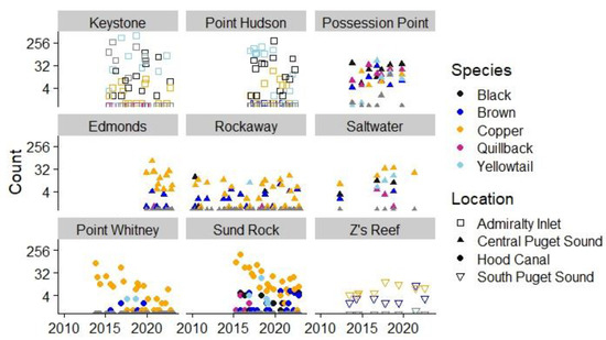 Preliminary visualizations of the data using ggplot2 and tidyverse revealed variation based on season, basin, and species [27,28]. Seasons were defined by month as follows: winter (December–February), spring (March–May), summer (June–August), and autumn (September–November). To statistically analyze independence of summary parameters on season, we employed a two-way ANOVA [29] where assumptions were met for the Shannon Diversity Index distribution and a non-parametric Kruskal–Wallis rank sum test [26] on log-transformed adult rockfish count data. Both statistical tests are included in base-R stats package [30]; post hoc diagnostics relied on functions from the R packages FSA and PMCMRplus [31,32]. Seasonal analysis was completed using 2017–2023 data from Keystone Jetty, Point Hudson, Point Whitney, Rockaway, Sund Rock, and Edmonds Underwater Park, which were the years and sites with seasonal sampling (Figure A1).