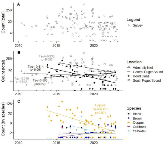Scatterplot with line of best fit for adult rockfish counts, with log-transformed y-axes for improved visualization of low count values. (A) Total adult rockfish counts from all surveys; (B) Total adult rockfish counts from all surveys by basin, with Kendall’s rank correlation results shown for each basin. Shape and color correspond to the basin as follows: Hood Canal—black closed circles; South Puget Sound—dark grey open inverted triangles; Admiralty Inlet—grey open squares; Central Puget Sound—light grey closed triangles; (C) Hood Canal sites only: Adult rockfish counts for each species at each survey; Kendall’s rank correlation test shown for Copper rockfish. In this panel, each data point corresponds to a count for a single rockfish species at a given site and date.