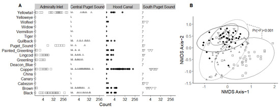 Community structure by location. Grayscale color and shapes correspond with basin for Hood Canal (filled circles), South Puget Sound (inverted open triangles), Central Puget Sound (filled triangles), and Admiralty Inlet (open squares), in order from darkest to lightest shade. (A) Dotplot of species observed by location grouping, with log-transformed x-axes for improved visualization of low count values; (B) Two-dimensional nMDS ordination for community structure by location group, with probability of F-statistic for PERMANOVA analysis comparing Central Puget Sound and Admiralty Inlet.