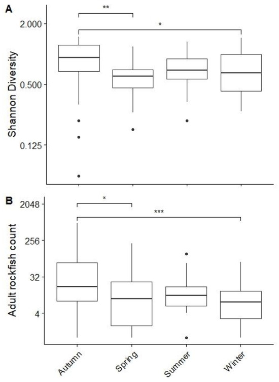 Boxplots for (A) Shannon Diversity Index by season, with post-hoc pairwise adjusted p-values displayed where significant, and (B) Adult Rockfish count by season, with post-hoc pairwise adjusted p-values displayed where significant. For both (A,B), significance thresholds are as follows: p < 0.1 *, p < 0.05 **, and p < 0.01 ***. Sample sizes are as follows: Autumn (n = 51), Spring (n = 43), Summer (n = 26), and Winter (n = 37). Y-axes are log-transformed for improved visualization.
