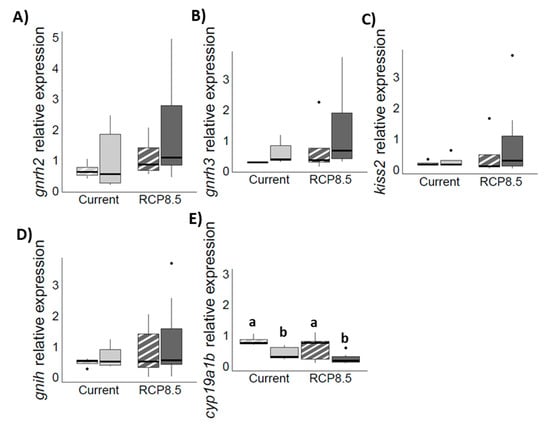 - Bock, S.L.; Chow, M.I.; Forsgren, K.L.; Lema, S.C. Widespread Alterations to Hypothalamic-Pituitary-Gonadal (HPG) Axis Signaling Underlie High Temperature Reproductive Inhibition in the Eurythermal Sheepshead Minnow (Cyprinodon variegatus). Mol. Cell. Endocrinol. 2021, 537, 111447. [Google Scholar] [CrossRef]