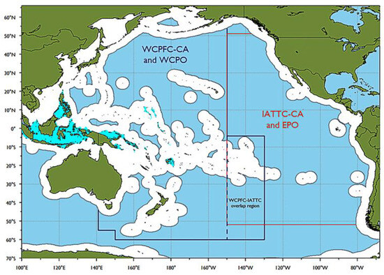 Important national, regional and management zones in the Pacific. The WCPFC Convention Area (WCPFC-CA) is outlined in dark blue, the IATTC Convention Area (IATTC-CA) area is outlined in red. The western and central Pacific Ocean (WCPO) includes all of the WCPFC-CA, minus the overlap with the IATTC-CA; the eastern Pacific Ocean (EPO) is coincident with the IATTC-CA. Pacific nation EEZs are outlined in grey and archipelagic waters are shaded turquoise [23].