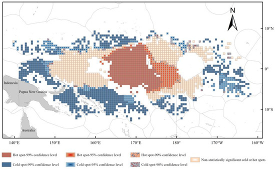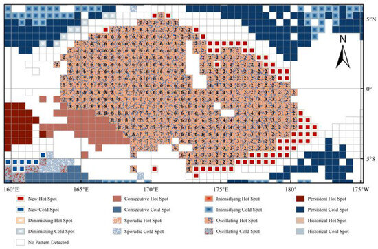 - The new hotspots in the study area (63 in total) are concentrated between 166.5° E and 178° W, and between 5.5° N and 6.5° S. These locations exhibited statistically significant hotspots in 2018–2019 (Table 4), but not in previous years. The new hotspots are generated around oscillating hotspots (Figure 4).