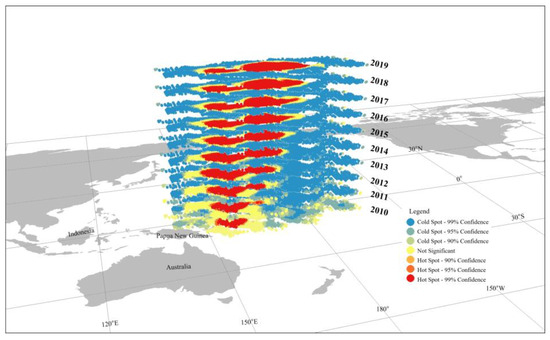 Results of the three-dimensional hotspot analysis of total annual catch, with each layer representing a year, analyzing the hotspot movement trend of skipjack CPUE from year to year, with an overall eastward trend between years.