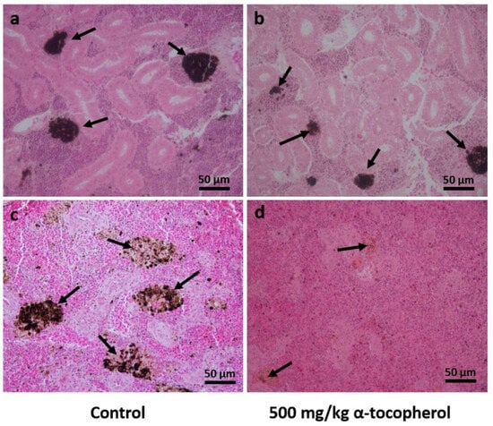 Histological observation of the tissue sections confirmed that the spleen was surrounded by a capsule with a simple cubic epithelium and thin connective tissue, from which irregular trabeculae emerged and extended into the parenchyma. In S. rivoliana, the splenic parenchyma was formed from a network of reticular cells fed by vascular sinusoids. The MMCs of organisms fed with both control (Figure 1a) and VE (Figure 1b) diets were observed to be supported with collagen surrounded by ellipsoids, generally rounded structures with a capillary center and lined with a simple cuboidal epithelium. The kidney of S. rivoliana is a mixed organ comprising hematopoietic, reticuloendothelial, endocrine, and excretory elements, which have the basic cellular architecture like another teleost. The MMCs are histologically distinguishable within the tissue for presenting macrophages with distinct pigments such as melanin, hemosiderin, and lipofuscins (Figure 1c,d).