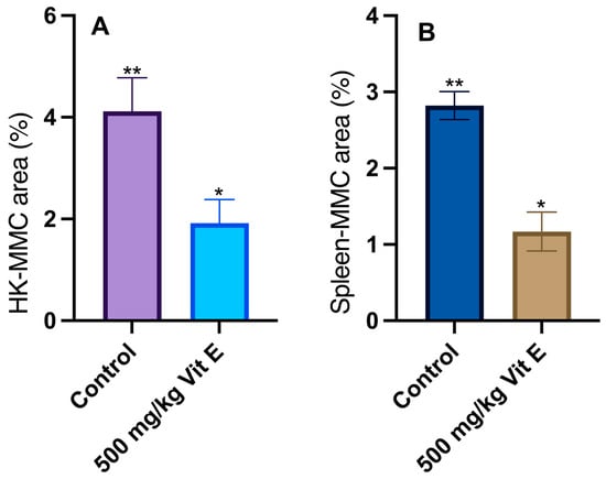 Percentage of (A) head kidney (HK-MMC) and (B) spleen (spleen-MMC) melanomacrophage coverage area in the control and VE-supplemented (with 500 mg/kg of ⍺-tocopherol) groups. The values are expressed as mean ± standard deviation (Student t-test; p < 0.05; n = 3). Asterisks show statistical differences between treatments (Student t-test; p < 0.05; n = 3).