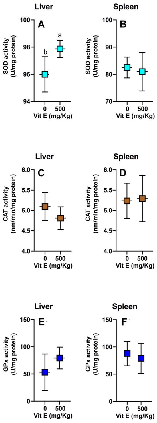 Enzymatic activities of the redox system. SOD: Superoxide dismutase activity (U mg protein−1) for (A) liver and (B) spleen, GPx: Glutathione peroxidase activity (U mg protein−1) for (C) liver and (D) spleen, and CAT: Catalase activity (nmol mg protein−1) for (E) liver and (F) spleen. The values are expressed as median ± interquartile range. a,b show statistical differences between treatments (Student t-test; p < 0.05; n = 3).