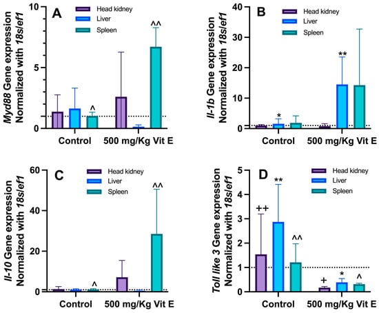 Relative gene expression (mean ± SD) of (A) Myeloid differentiation primary response 88 (MyD88), (B) Interleukin-1β (il-1β), (C) Interleukin-10 receptor subunit beta (il-10), and (D) Toll factor receptor 3 (Toll-like 3) in S. rivoliana juveniles. Symbols compare gene expression between treatments (control vs 500 mg/kg Vit E) for head kidney (+), liver (*) and spleen (^). Double symbol indicates differences between treatments. (U Mann–Whitney test; p < 0.05; n = 3).