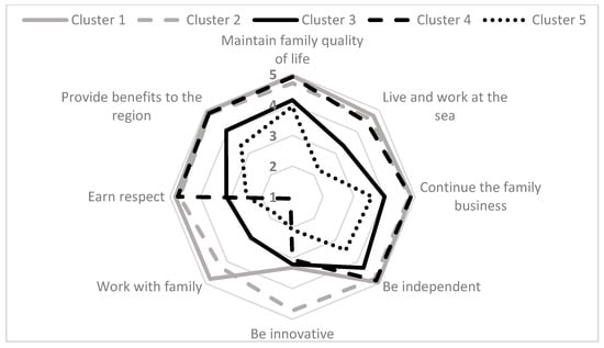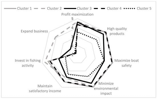 The mean ratings of the objective statements per cluster are presented in Table 6. The highest—and in some cases also the lowest—mean rating that each objective received is highlighted in bold. Profit maximization received high ratings—higher than the global average—in cluster 2 and cluster 3, while in cluster 5 it received the lowest rating. In particular, in cluster 3, the objective of profit maximization, as well as the objective of providing high quality products, was very important, and these are perhaps the main drivers of the behavior of fishers in this group. For fishers in cluster 2, the objectives of profit maximization and providing high quality products were also very important. However, the main characteristic of cluster 2 is the fact that the objectives of investing in fishing activity and being innovative were rated very high, while they were quite insignificant for the fishers in the other clusters.