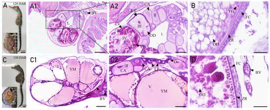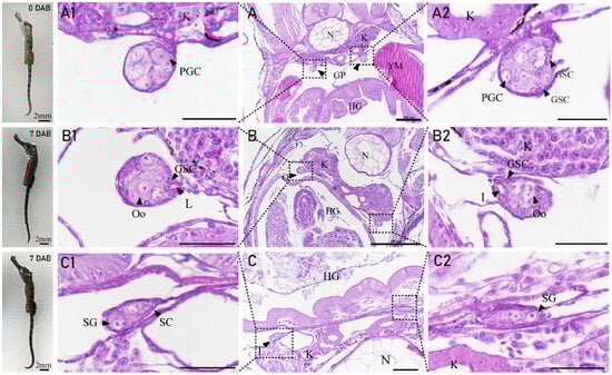 - Rasmussen, T.H.; Jespersen, A.; Korsgaard, B. Gonadal morphogenesis and sex differentiation in intraovarian embryos of the viviparous fish Zoarces viviparus (Teleostei, Perciformes, Zoarcidae): A histological and ultrastructural study. J. Morphol. 2006, 267, 1032–1047. [Google Scholar] [CrossRef]