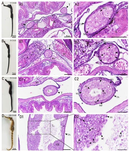 - Carcupino, M.; Baldacci, A.; Corso, G.; Franzoi, P.; Pala, M.; Mazzini, M. Testis structure and symplastic spermatid formation during spermatogenesis of pipefishes. J. Fish Biol. 1999, 55, 344–353. [Google Scholar] [CrossRef]
