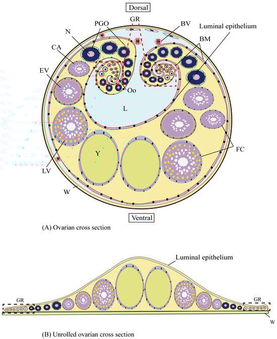 - Mazzoni, T.S.; Grier, H.J.; Quagio-Grassiotto, I. Germline cysts and the formation of the germinal epithelium during the female gonadal morphogenesis in Cyprinus carpio (Teleostei: Ostariophysi: Cypriniformes). Anat. Rec. 2010, 293, 1581–1606. [Google Scholar] [CrossRef] [PubMed]