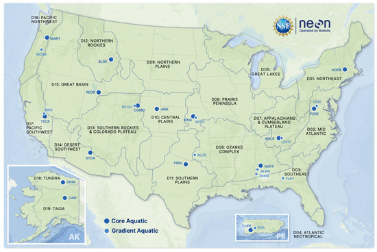 - A NEON (National Ecological Observatory Network). Aquatic Field Sites—Excluding Lake Sites—Across the NEON Domains. Courtesy of National Ecological Observatory Network/Battelle. Available online: https://www.neonscience.org/field-sites/explore-field-sites (accessed on 1 November 2023).