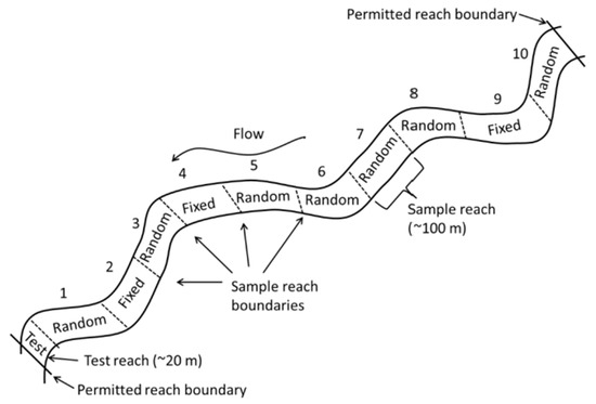 NEON stream sites are 1 km long and divided into 10 (80–100 m) reaches, except for MCDI, where the sampling permit restricts the site to 500 m. Six (80–100 m) reaches are scheduled for DC backpack electrofishing at each site (except MCDI, with three reaches scheduled per bout), using the NEON wadable stream fish sampling protocol at every site [16]. No major protocol changes occurred over the six years of this study. Three of the six scheduled reaches were fixed reaches sampled every visit (Figure 2) by employing three-pass depletion sampling. The other three reaches included random reaches that came from a panel of seven random reaches sampled on a rotating schedule. Each random reach was randomly selected before the first year of sampling and scheduled for sampling so that each random reach was scheduled to be sampled at least once every three years, and random reaches were sampled on a single pass. At MCDI, where land ownership and permitting the restricted site length to 500 m occurred, there were five designated reaches; therefore, each year, only two fixed and one random reach were sampled per bout per year.