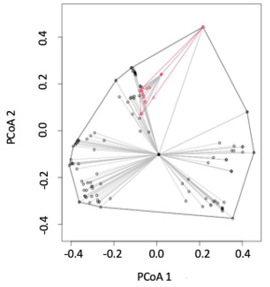 PCoA distances for fish species sampled at NEON sites from 2017 to 2022 and apportioned by Atlantic (black circle) vs. Pacific (red triangle) drainage.