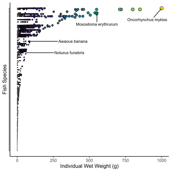 Captured fish were identified to the lowest taxonomic level possible based on [17] and the Integrated Taxonomic Information System (ITIS) online database (http://www.itis.gov accessed on 31 July 2017). When field scientists responsible for identification were uncertain, they used a morphospecies or identification qualifier. Some fish were identified only to their family or genus (followed by an SP. or SPP.). Federally listed species are obscured when published so that they appear identified at the family level; this protects listed species and is part of the NEON agreement with the U.S. Fish and Wildlife Service.