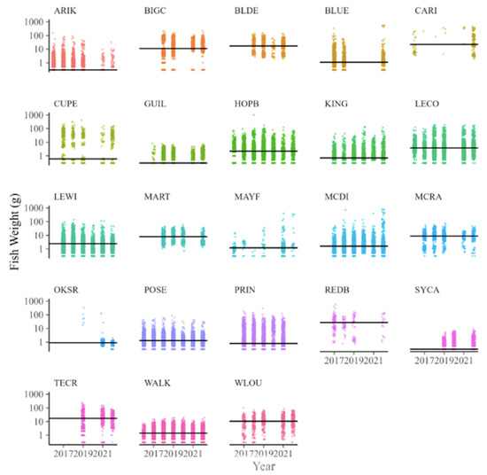 Individual fish wet weights (n = 52,882) collected across 23 NEON stream sites from 2017 to 2022. The horizontal line shows the grand median for each site.