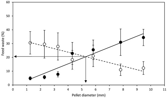 Effect of pellet diameter on hard and dry pellet (HDP); (1) non-feeding related waste (NFRW), white symbols; and (2) feeding related waste (FRW), black symbols. The dashed line shows linear regression for NRFW y = −2.5x + 34.0, R2 = 0.105, p = 0.015; the solid line shows linear regression for FRW y = 4.0x − 0.7, R2 = 0.32, p = 0.000. Intercept of regressions, x = 5.3, y = 20.5. Values are average, error bars denote S.E.