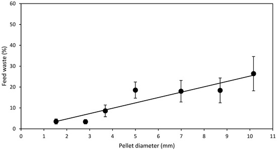 Effect of pellet diameter on soft and moist pellet (SMP) feeding related waste (FRW). The line shows linear regression for FRW y = 0.26x − 0.4, R2 = 0.26, p = 0.000. Values are average, error bars denote S.E.