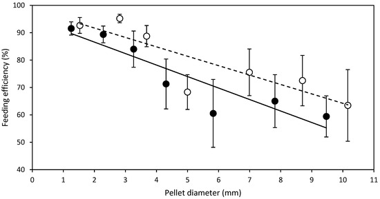 Effect of pellet diameter on feeding efficiency of (1) soft and moist pellet (SMP), white symbols, the dashed line shows linear regression y = −3.4x + 98.6, R2 = 0.193, p = 0.001 and (2) hard and dry pellet (HDP), black symbols, the solid line shows linear regression y = −4.2x + 95.0, R2 = 0.222, p = 0.000. Values are average, error bars denote S.E.