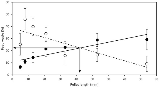 Effect of pellet length on hard and dry pellet (HDP) (1) non-feeding related waste (NFRW), white symbols and (2) feeding related waste (FRW), black symbols. The dashed line shows linear regression for NFRW y = −0.38x + 38.5, R2 = 0.197, p = 0.001; the solid line shows linear regression for FRW y = 0.26x + 10.8, R2 = 0.207, p = 0.000. Intercept of regressions, x = 42.4, y = 22.2. Values are average, error bars denote S.E.