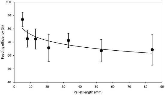 Effect of pellet length on hard and dry pellet (HDP) feeding efficiency, the line shows logarithmic regression y = −6.6ln(x) + 91.0, R2 = 0.075, p = 0.041. Values are average, error bars denote S.E.