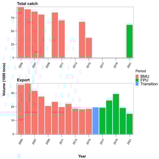 During the BMU period, there was a consistent decline in overall Nile perch catches from ~90,000 t in 2005 to <50,000 t in 2015, and fish exports declined by 50% from 2005 to 2008, after which they remained relatively constant until increasing in 2018 (Figure 2). Fisheries on Lake Victoria supply more than 90% of Uganda’s total exports []. Exports continued to increase in 2019 when they were 60% higher than at the end of the BMU period. The observed decline in exports in 2020 and 2021 could be attributed to the stringent COVID-19 pandemic restrictions, where few fishery actors were required to work thus affecting the quality and quantity of Nile perch available for processing and export [].
