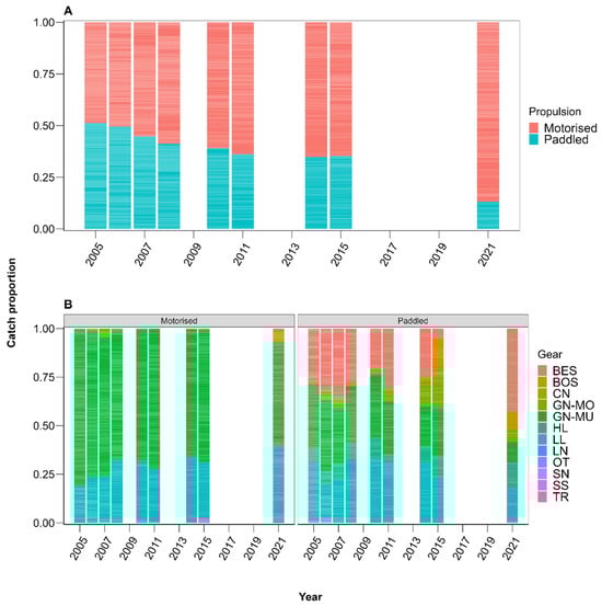 The proportion of Nile perch catches from vessels sampled in the study period by (A) vessel propulsion as paddled and motorised and (B) and gears; BES—Beach Seines, BOS—Boat Seines, CN—Cast nets, GN–MU—Multifilament gillnets, GN–MO—Monofilament gillnets, HL—Hand line hook, LL—Longlines, LN—Lift nets, MF—Monofilament, and OT—Other unidentified gears, SN—Scoop net, SS—Seine nets, TR—Basket traps.