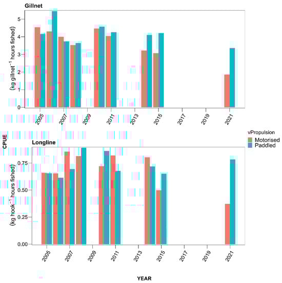 The following supporting information can be downloaded at: https://www.mdpi.com/article/10.3390/fishes8110563/s1, Figure S1: Legal/illegal hook size use between paddled and motorised gillnets for the study period based on catch assessment surveys in 2005–2008; 2010–2011; 2014–2015 and 2021, Figure S2: Comparison of the fish size distribution for the vessel groups; motorised and paddled and gears; gillnets and longlines; Table S1: ANOVA results for CPUE of the gillnets and longline vessel trips, Table S2: CPUE post hoc tests for gillnet and longline vessel trip comparisons.