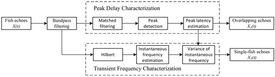 The method of detecting the single fish echo signal is shown in Figure 2. In the time domain, the single target echo with high distance resolution is obtained by pulse compression of the echo signal through a matched filter. Based on the peak detection algorithm, the time delay estimate between the peaks of the single target echo is used to exclude overlapping echoes. Ideally, if two peaks are separated by a distance larger than the pulse width of the transmit signal, it can be regarded as a single fish echo. However, peak detection may fail when individual echoes with significant differences in target strength overlap. In this case, although the echo time delay meets the conditions, there is a possibility that the overlapped echoes will be misidentified as single fish echoes.