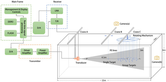 The experimental setup was built in an anechoic water tank, as shown in Figure 3, with dimensions of 15 m × 7 m × 6 m. At a depth of 3 m in the tank, the transducer, the single target, and the group targets were set up sequentially. Among them, the SIMRAD ES200-7C transducer was placed on Crane A. The single fish target simulated by a tungsten carbide alloy ball (diameter 20 mm), which can be moved with Crane B to simulate different target spacing for singles and schools, was suspended under Crane B. Groups of fish targets simulated by tungsten carbide alloy balls were suspended beneath the rotating mechanism (diameter = 2 m) and randomly distributed (Figure 3). The discs were fixed on the rotating mechanism of Crane C and could be rotated accordingly to simulate the state and spatial distribution of different fish groups. Cameras a and b were installed at the top of the anechoic water tank and underwater to monitor the distance and status of the single and group targets.