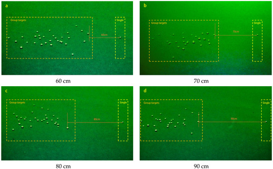 Group targets state and spatial distribution during echo acquisition. An underwater camera took the pictures during the experiment, in which the spacing between the single and group targets was 60 cm (a), 70 cm (b), 80 cm (c), and 90 cm (d). The tungsten carbide spheres are roughly centrosymmetrically distributed within the beam. The inconsistency in group diameters stems from subtle errors in front-to-back distances during underwater camera shots.