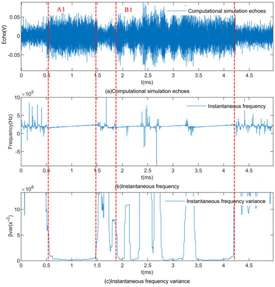 Figure 5a shows a typical group target echo, including a single target echo and overlapping echoes. Among them, rectangle A1 is the single target echo, and rectangle B1 corresponds to the overlapping echoes. Based on the Hilbert transform, the instantaneous frequency of the acquired echo signal is estimated. The result is shown in Figure 5b, which shows that the instantaneous frequency of the signal corresponding to the moment of the single target echo is a tilted straight line with no frequency jump. The time width is close to the pulse width of the transmit signal, which is about 1 ms. The result of obtaining the variance of the instantaneous frequency through a sliding window is shown in Figure 5c. The instantaneous frequency variance of the signal corresponding to the single target echo tends to be close to 0, which is significantly different from that of the overlapped echoes. The single target and overlapped echoes can be distinguished by setting a reasonable instantaneous frequency variance threshold.