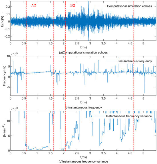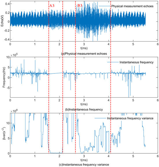 Under the equivalent conditions of spacing 80, bandwidth 100 kHz, duration of transmitted signal T = 1 ms, and the number of group targets set at 30, Figure 6a shows the echo signals of the fish group simulated by the computer, and Figure 7a shows the echo signals of the physical model of the fish group actually captured in the anechoic pool. After a consistent processing procedure, it can be seen that the experimentally collected single target echo has an instantaneous frequency characteristic which is consistent with the simulation. It can be discriminated by relying on the instantaneous frequency variance threshold, where A2 and A3 are single targets and B2 and B3 are group targets.