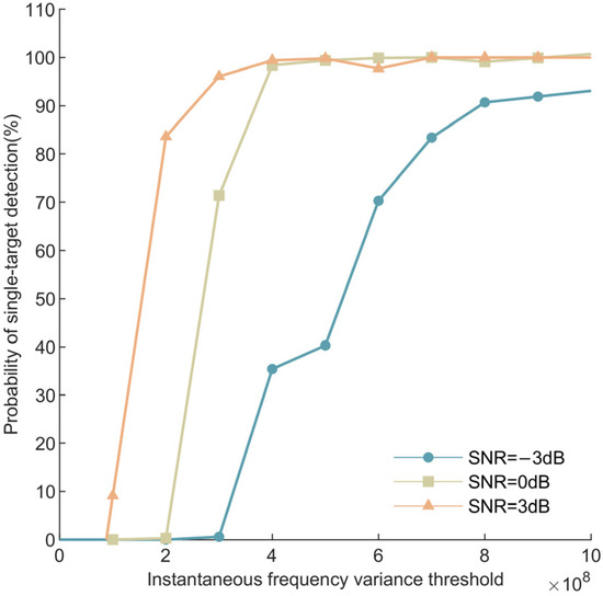 Figure 8 shows the effect of the instantaneous frequency variance threshold setting on the accuracy of single target echo detection under different signal-to-noise ratio conditions. When the density of the fish group is set to 10 fish/m3, and the spacing between the single and group targets is 90 cm, the simulation results show that with the increase in the instantaneous frequency variance threshold, the probability of single target detection gradually increases. When the instantaneous frequency variance threshold is set to 8 × 108 and above, the detection probability of single target echoes can reach a level of 90% under the condition of SNR = −3 dB. Theoretically, its instantaneous frequency variance for the single target echoes tends to be close to 0. However, by the noise interference, the instantaneous frequency of the small target individual echoes will appear to have a certain degree of jitter, and appropriately increasing the detection threshold can increase the detection rate of the single target echoes.