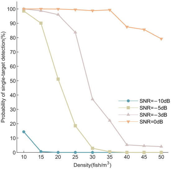The density of the fish school is also an essential constraint on the effectiveness of single target recognition. When the density of the school is high, it dramatically reduces the probability that a single target will stray out of the school. As the spacing between single targets in the group space decreases, the separation performance of single fish echo decreases. In addition, the secondary scattering of acoustic waves between group targets increases with group density, which also brings more clutter interference. Figure 10 shows the probability of single fish echo detection for different signal-to-noise ratio conditions and fish density cases. The results show that as the density of the fish schools increases, the single fish echo detection probability decreases for all SNR conditions. At SNR = −5 dB and below, the single fish echo could not be detected effectively when the fish school density was more than 25 fish/m3. When SNR = −3 dB and above, the single fish echo could be detected effectively for a fish school density below 40 fish/m3. The high-intensity fish school’s recognition probability is higher when the signal-to-noise ratio condition is good.