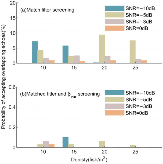 Figure 11 shows the probability of overlapping echoes being misidentified as a single target for different signal-to-noise ratio conditions and different densities of fish schools. Figure 11a shows the overlapping echo misidentification rate using the matched filter output envelope peak-to-peak delay feature for primary screening. Figure 11b shows the result of adding the instantaneous frequency variance for secondary screening. By improving the signal-to-noise ratio, the simulation showed a decrease in misidentification rates for all fish densities when the single and group spacing was set to 90 cm. For the higher density school, having a lower false identification rate under the poorer SNR condition of SNR = −10 dB may stem from the fact that the low SNR brings in a large amount of random noise and is picked up by the peak threshold, causing all the targets to be excluded by the initial screening based on the inter-peak pulse width. This conjecture is corroborated by the performance of the single target recognition accuracy of the high-density fish in the low SNR condition in Figure 11.