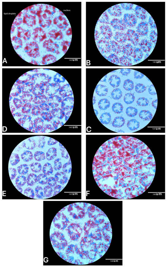 Example images of hepatopancreatic histology from shrimp fed experimental diets. (A) (Control), (B) (EPH0.2%), (C) (EPH0.4%), (D) (EPP0.03%), (E) (EPM3%), (F) (DMPT0.01%) and (G) (SP1%) were measured at a 40× objective magnification. The lipid droplet is orange–red or bright red, and the nucleus is blue.