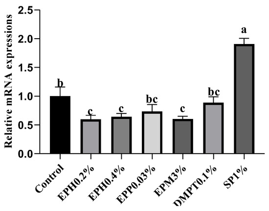 Plasma lipid-metabolism-related biochemical parameters are presented in Table 6. Plasma TG concentration in fish fed E. prolifera bio-products, especially the EPH0.4%, EPP0.03% and EPM3% diets, significantly decreased compared to fish fed the control and DMPT0.1% diets (p < 0.05). In addition, the concentration of plasma LDL-C from the E. prolifera bio-product groups showed a decreased trend compared to the control diet (p > 0.05), and was significantly lower than that of the DMPT0.1% group (p < 0.05). However, HDL-C in plasma was not affected by dietary treatments (p > 0.05).